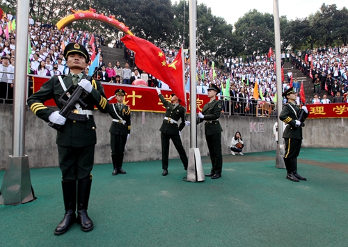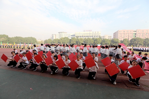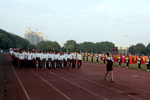 入场式结束后,国旗护卫班的同学们迈着矫健整齐的步伐坚定地走向升旗台,在庄严的国歌声中,在全体站立师生的注目礼下,五星红旗冉冉升起在赛场上,飘扬在 的上空。