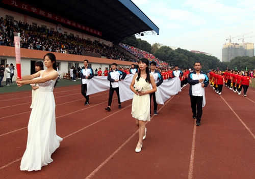 上午8点,在雄壮音乐的伴奏声中,开幕式的入场式仪正式开始。护校旗队、护会旗队、护会徽队、管乐队、鲜花队、彩旗方阵队、裁判员代表先后入场。一支支队伍昂首挺胸,迈着坚定有力的步伐秩序井然地从主席台前依次经过,接受检阅。当他们神采奕奕、精神抖擞地展现青春风貌的时候,融汇而成的正是整个九院的非凡风采。他们的飒爽英姿,是对九院风采的最佳诠释。