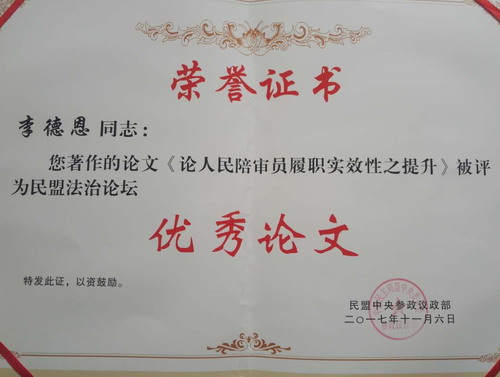 委员会文体支部组织委员、政法学院李德恩教授应邀出席论坛并作大会发言,其论文《论人民陪审员履职实效性之提升》获得民盟中央表彰。