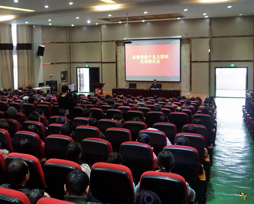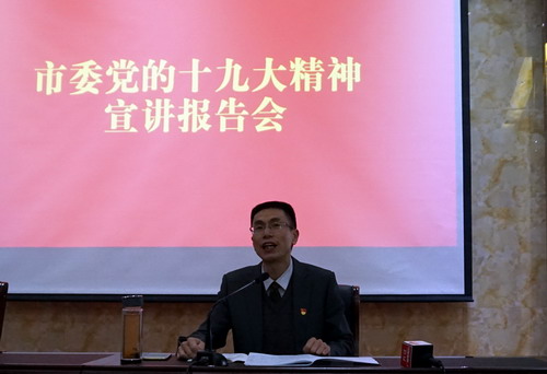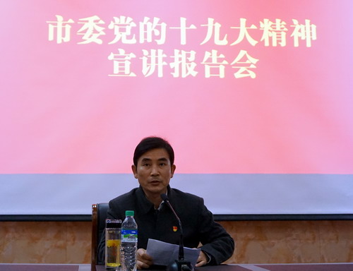 为了认真学习宣传贯彻党的十九大精神,11月20日下午,学校在香远楼报告厅学校举行市委党的十九大精神宣讲报告会。市委宣讲团成员、市广播电视台台长荣君作宣讲报告,校党委副书记魏立平主持报告会。副校长王万山、陈春生及全校副科以上干部、教师代表、学生代表300余人参加了报告会。