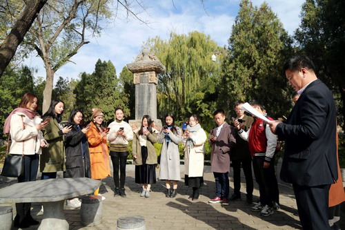 11月23日上午,为期三天的“白鹿·嵩阳书院文化之旅”交流活动迎来尾声,陈春生副校长一行在郑州大学文化素质教育办公室主任吴艳丽老师等的陪同下前往嵩阳书院进行参访,在古柏和翠竹掩映的讲堂里,体悟书院文化历经千年的生命力。最后,两校师生在杏坛集体朗诵《嵩阳,为了与你相遇》,活动在朗朗的吟诵声中圆满结束。