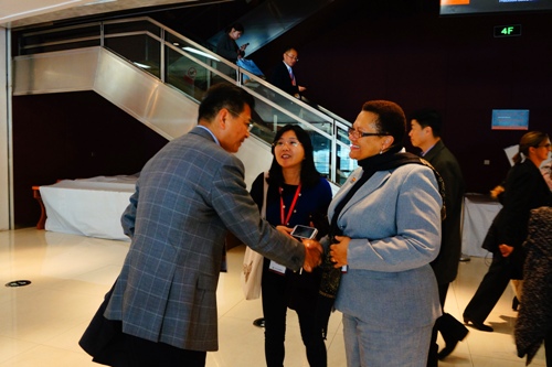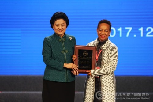 刘延东副总理出席大会并为先进孔子学院颁奖(新华社摄)