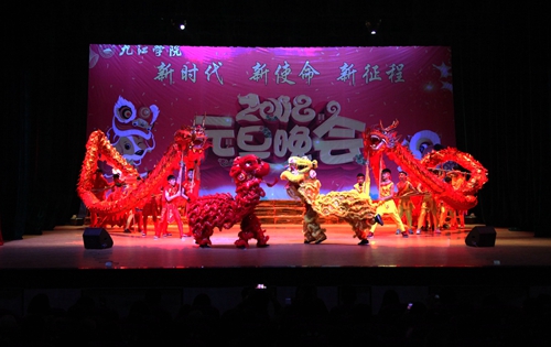 伴随着欢快热情的开场舞曲,晚会在体育学院舞龙队《中国龙》火热的舞龙表演中拉开了帷幕,伴着激昂的音乐,舞龙招式多样,变化灵活,展现龙的精、气、神、韵,寓意着2018年是平安的一年,祥和的一年,丰收的一年。本场晚会由田鹏瑞、熊佳雯、黎心佑、王鹏朝四位同学担任主持。整场晚会节目丰富多彩,包括歌曲、舞蹈、古筝合奏、朗诵、音诗画、乐队表演、队列表演、健美操、歌伴舞等16个各具特色、不同形式的节目,展现了我校师生的多才多艺以及积极向上的精神风貌,给观众们带来了一场美轮美奂的视听盛宴。