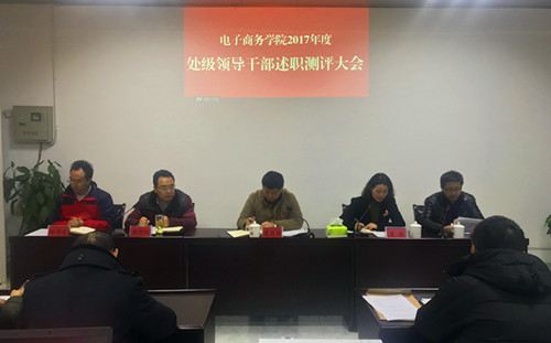 述职会上,电商学院党委书记丁文林代表党委班子作2017年度党委工作报告,院长郑祚双代表行政班子作2017年度学院行政工作报告。各处级干部分别从德、能、勤、绩、廉、法等方面进行述职。全体教职工对学院党政领导班子及个人进行了测评。