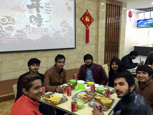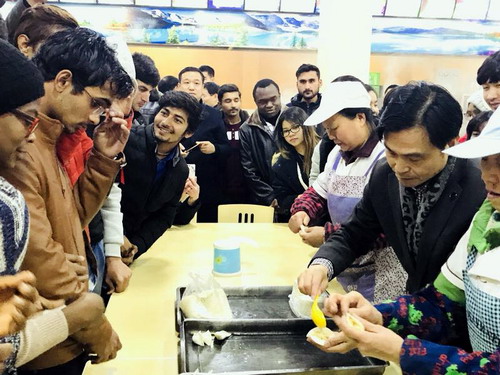 金鸡献瑞钦郅治,瑞犬呈祥展宏猷。2月9日正值中国传统节日——小年,我校在饮食服务中心教工餐厅举行了2018年留学生新年团圆饭活动。副校长杨耀防,后勤管理处处长姜东升、国际交流学院负责人帅式毅、副院长何广,饮食服务中心主任蔡飞以及我校20多个国家160余留学生欢聚一堂,共进小年团圆饭,感受别样中国年。