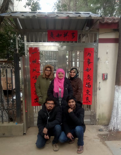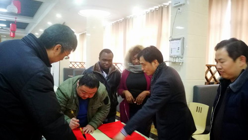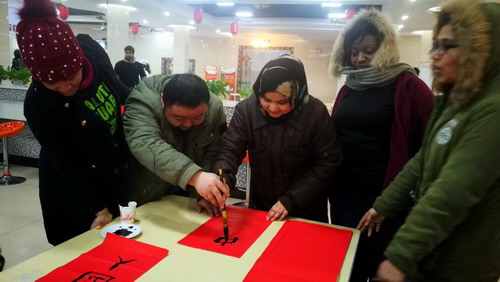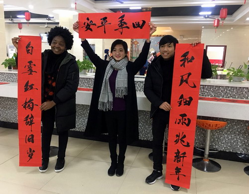 温情年夜饭,异乡享团圆。年夜饭饱含着学校领导和老师对留学生的关护,充满着浓浓的家的温情。整个年夜饭活动让现场每个人都感受到了浓浓的新年气息,也令身在中国的留学生们体会到了一份家的温暖。“恭贺新禧! ”“新年快乐! ”留学生在吃得开心玩得尽兴的同时,也不忘和在场的老师、同学们相互祝贺。大家还拿起手机纷纷拍照、发朋友圈与家人朋友共同分享来自中国的年味。留学生Sanna兴致很高地说,“这个中国年其实一点也不寒冷。”来自喀麦隆的Foka开心的说:学校安排的年夜饭很贴心,年夜饭好吃极了,极大减轻了我想家的感觉;来自柬埔寨的Nathalie同学表示:学校的年夜饭,不仅是一次年夜饭,更是一次精神的会餐,让他更加感受到中华民族的传统文化博大精深。团圆饭后现场书写的大红对联张贴在留学生公寓楼里,不少寝室都贴着新春对联或者剪纸,让满是“异乡人”的楼道里年味十足。