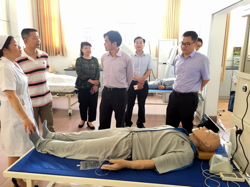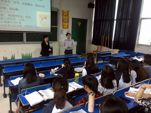 汇报会结束后,督查组一行实地走访了基础护理实验室、健康评估实验室、手术室等五个实验室,认真听取讲解员讲解,现场观摩了2015级护理本科班实习前强化训练课程。随后,督查组进入护理学院评估资料室随机抽查了教师工作手册、试卷及教案讲稿等材料。杨耀防副校长还提前深入护理学院教室查看了师生课堂教学情况,重点听了邹敏老师的课并给予高度评价。