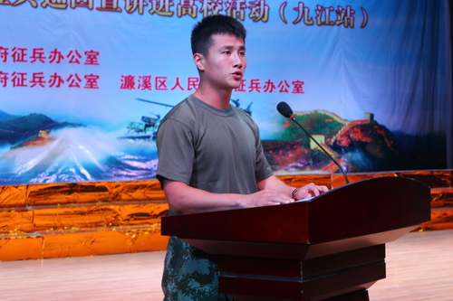 省内高校退役大学生陈佳美、李俊、纪达、徐菁焓、陈奕磊、宋东洋、李江波组成的退役大学生代表开展了征兵宣讲。作为江西高校学子参军的优秀代表,他们每个人都曾在服役期间获得过多次嘉奖或荣誉,退役后在工作和学习岗位上也作出了成绩。他们用铿锵有力的语言从意志锻炼、战友情谊、强身健体、难忘经历等多方面分享了自己的军旅生涯;从国家为大学生参军在优先优待、考研升学、选用培养、就业等政策做了介绍,鼓励同学们到火热军营中放飞青春、建功立业、报效祖国。