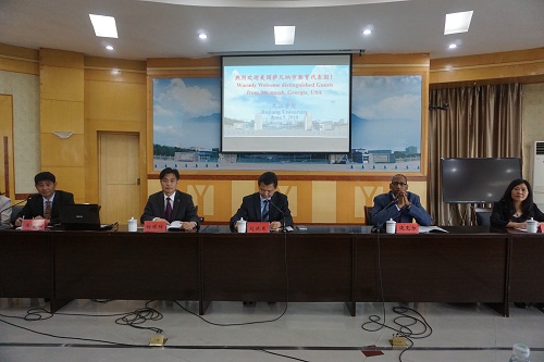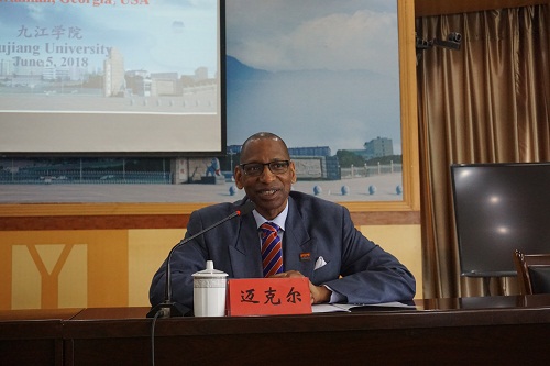的办学历史与规模、办学特色和国际交流情况。刘校长说,今年是我校第二次承接美国萨凡纳市教育工作者中国文化体验团,我校高度重视并做了精心安排:既有教学实践、又有学术讲座;既有大学座谈交流,也有中小学考察观摩;既有自然风光欣赏,又有人文景观体验。同时,我们还会走出九江,感受景德镇的陶瓷文化、北京的古都文化等。相信此次项目一定会为萨凡纳市教育工作者了解中国及中国文化、促进中美相互交流和友好起到了很好的作用。最后,刘校长对各位美国校长和教师积极参与孔院活动表示由衷的感谢,对迈克尔·莱尼团长为孔子学院的发展所付出的努力和心血表示赞赏,并相信在迈克尔·莱尼团长和我校选派的中方院长罗其娟的共同努力下,两校通力合作,萨凡纳州立大学孔子学院一定会发展得越来越好。
