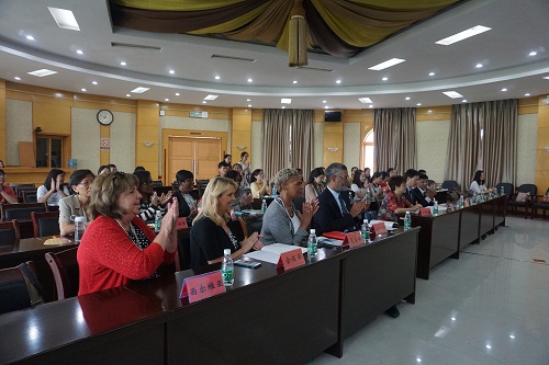 的精心安排表示衷心的感谢。接着,他介绍了萨凡纳州立大学的办学历史,并对萨凡纳州立大学孔子学院4年的发展表示肯定。他说,此次来到中国,他和代表团成员们将会学到很多东西,希望通过此次活动,代表团成员们能进一步体验汉语乐趣、了解中华文化、感受中国风情、加强中美文化交流。最后他预祝此次活动取得圆满成功。欢迎仪式过程中,我校师生还与美国体验团贵宾们进行了热烈的互动交流。