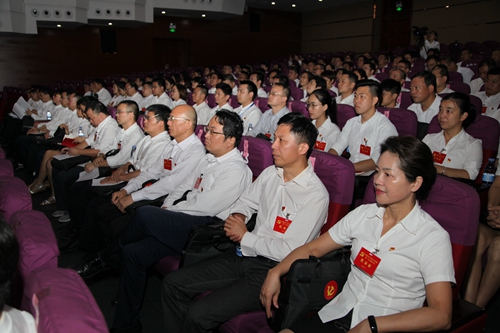 第一次代表大会”,十面鲜艳的党旗分列主席台两侧,正中簇拥着的党徽闪耀着金色的光芒。会场两边的屏幕上写着:“坚持人才强校,提升育人质量,推进改革创新,激发办学活力”,会场后方,“不忘初心,牢记使命,奋力谱写新时代