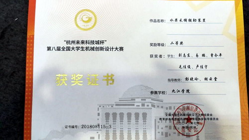 我校机械与材料工程学院非常重视和支持学生参加该项大赛,从2017年下半年,就启动了院级选拔活动,选派作品参加全国大学生机械创新设计大赛江西赛区预赛,“一种草莓快速采摘辅助装置”和“水果采摘辅助装置”荣获江西赛区预赛一等奖,并被选拔入选参加全国决赛。从6月份以来,参赛师生克服各种困难,对预赛作品重新进行设计加工、包装等。