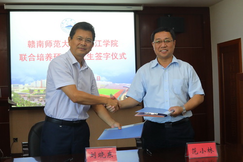 8月29日上午,赣南师范大学与 联合培养硕士研究生签字仪式在我校行政楼党委会议室举行,赣南师范大学校长范小林、副校长罗序中,我校校长刘晓东、副校长王万山、副校长陈春生出席仪式,两校相关部门负责人参加了仪式。
