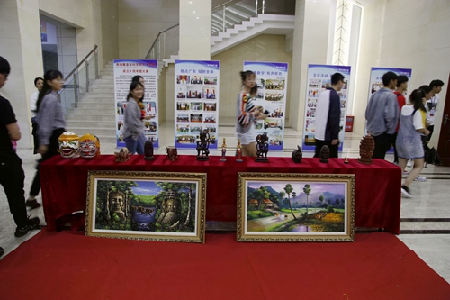 文化节的现场,柬埔寨学生搭建的具有柬埔寨特色的茅屋,制作的手工艺品以及摆放的传统服饰洋,使整个展厅洋溢着浓浓的柬埔寨文化风情。陈列厅里展示了柬埔寨孔子学院成立十周年的成果:柬埔寨皇家科学院孔子学院成立十周年图片展,全面展示了中柬合作共建的柬埔寨皇家科学院孔子学院十年来,从无到有,从小到大,从弱到强的发展历程;孔子学院翻译出版的书籍,吸引了众多学者和师生们驻足浏览。