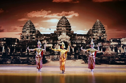 晚会在柬埔寨皇家学院的开场节目《祝福舞》中拉开序幕,表演者跳着优美的舞蹈,把金银花从天空洒下来,向观众表示着最美好的祝愿。