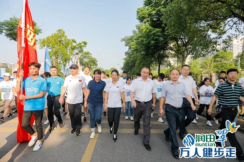为庆祝新中国成立70周年,纪念五四运动100周年,广泛开展全民健身活动,6月15日上午7点,2019润田翠万人健步走第六站——九江站在我校西大门活力开场。此次活动由江西体育总会、共青团江西省委、江西广播电视台主办,共青团北京市委副书记申雪、