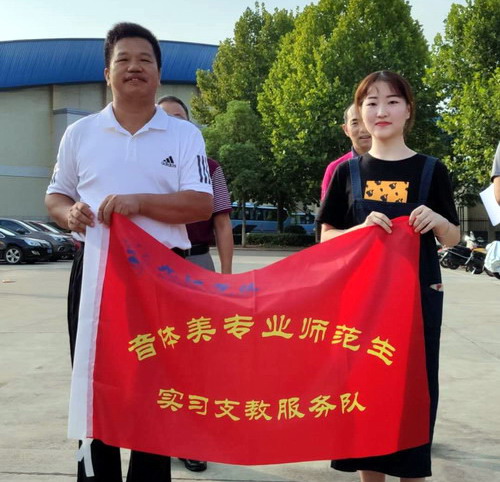 音体美专业师范生实习支教服务队”旗帜。陈春生勉励同学们安心支教,圆满完成实习支教任务,并祝愿同学们一路平安,一切顺利。