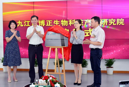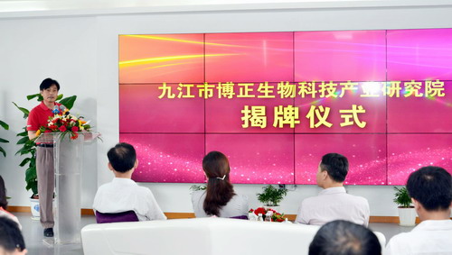 随后,市政府副市长李军、校党委书记赵伟、市委组织部副部长余响玲、江西博莱大药厂有限公司董事长唐进波共同为九江市博正生物科技产业研究院揭牌。