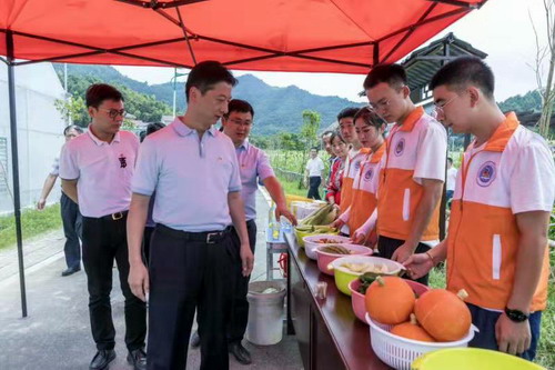 在有机蔬菜基地农产品展示区,基础医学院“三下乡”社会实践队员们正在制作酵素和农产品展示,同学们热情地向马书记介绍扶贫点有机蔬菜和皇菊深加工产品。