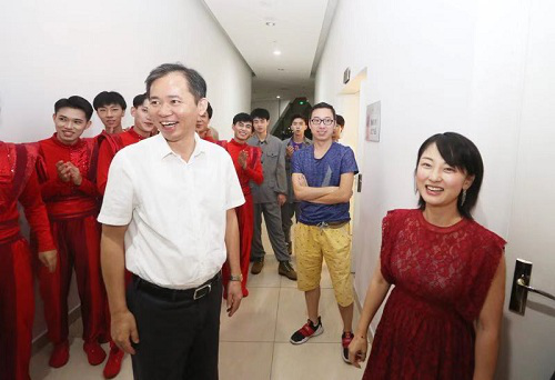 在晚会开始前,校党委书记赵伟来到演出现场,亲切问候参加本次晚会演出的艺术学院师生。