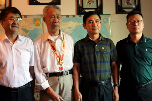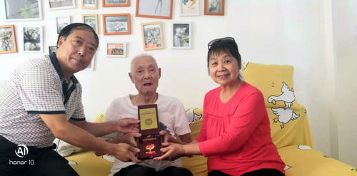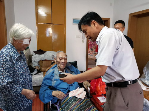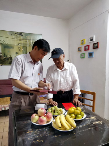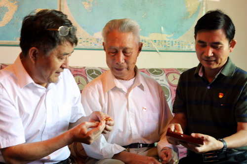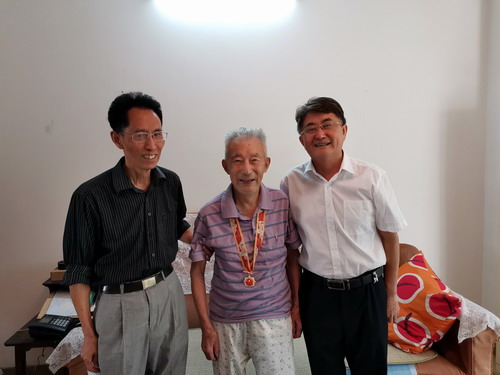 在学校浔东校区东9栋204室,校党委副书记魏立平代表学校前来看望慰问89岁高龄的离休干部、曾任 前身之一九江师专党委副书记的冷战魁老人,送上节日的问候和祝福。他亲切地询问冷老的生活和身体情况,亲手给冷老带上荣誉勋章、颁发荣誉证书,感谢冷战魁书记为学校发展作出的巨大贡献。老人胸前的党徽在荣誉勋章的衬托下,显得格外醒目耀眼。看着大家询问的目光,老人自豪地说:“我虽然年事已高,从领导岗位上退休了,但是我的党员身份永不退休!我一直把党徽戴在胸前,就是为了提醒自己,不忘自己的共产党人身份,永葆共产党员本色!”