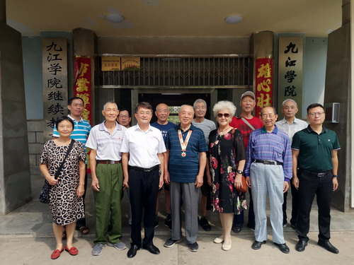 在庐峰校区5栋2单元201室, 前身之一九江医专离休老教授余坦洛家中,已经93岁高龄的老人和前来看望慰问他的副校长杨耀防拉起了家常,回忆起了自己当年在井冈山、在宁都慰问演出的事情。老人高兴地说:“现在党的政策好,吃得好、住得好、看病也有保障,最大的心愿就是希望有生之年能看到学校复名九江大学”。