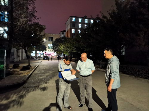 10月6日晚,在结束白天的安全值班后,副校长陈小林带队巡查校园安全和国庆假期值班情况。