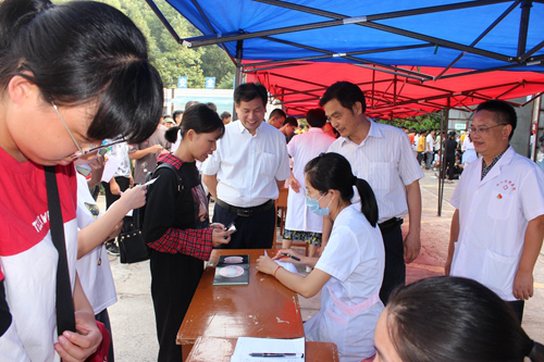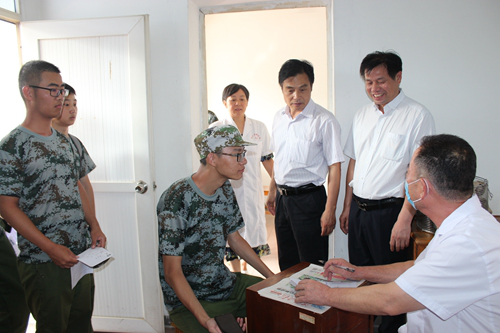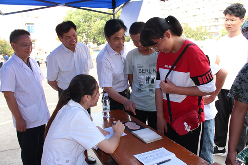 杨耀防在校医院院长贾宗林等人陪同下了解新生体检各项目检查点情况、体检流程和进度,并与部分体检工作人员和受检新生进行了亲切交谈,对新生体检工作组织严密、井然有序,工作人员认真负责等给予肯定,对医务人员的辛勤工作表示感谢。
