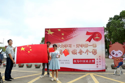 9月3日,是2019级新生报到的第一天,校团委吉祥物“九小团”在报到现场开展“开学第一课·我与国旗合个影 我为中国点个赞”的主题参与性活动。新生们手持国旗、录取通知书、告白留言板,将大学第一天的美好回忆定格在“青春向祖国告白”的誓言下。校团委负责人闫来英表示,新生开学第一课,就是要旗帜鲜明地进行爱国主义教育,不断增强大学生“不忘初心、牢记使命”的精神力量,激励大学生争做新时代的坚定者、奋斗者、搏击者,为祖国的繁荣昌盛而努力。
