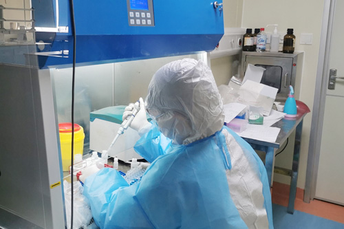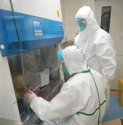 时间就是生命,面对严峻的疫情及潜在的感染危险,检验科近乎全员主动申请加入到抗击新型冠状病毒肺炎的第一线,放弃休假,返回工作岗位。科室6名骨干主动请缨,临危受命,成立了以检验科主任周会祥为组长的新型冠状病毒核酸检测团队,成为疫情战线上的排雷兵。为做好检测工作,在高峰时段检验科调配多位核酸检测人员,每天4个检测批次,单日新冠病毒核酸检测量突破80人份。截止至2月19日,已开展核酸检测1100余人份。