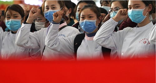 护理团队出征前郑重宣誓(前排左二为章婷、左三为殷美霞)