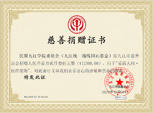 本次捐赠活动既是对中共九江市委统战部《致全市统战干部和统一战线成员的倡议书》和《致全市统一战线各界人士的倡议书》积极响应,也体现了作为参政党一员的民盟 委员会盟员同志们众志成城共克时难的一种担当。我们坚信,有中国特色社会主义的制度优势,有党中央的坚强领导,有各级党委政府的紧密部署和科学调度,有各界群众的同心同行、众志成城,我们必将战胜新型冠状病毒肺炎,我们也一定能够打赢这场疫情防控的人民战争、总体战、阻击战!