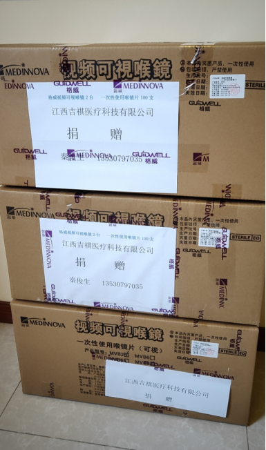 校友办的牵线搭桥,与我校附属医院负责捐赠事宜的钟老师沟通后,他们千方百计,紧急联系在深圳相关朋友和医疗机构,以江西吉祺医疗科技有限公司的名义购买并向