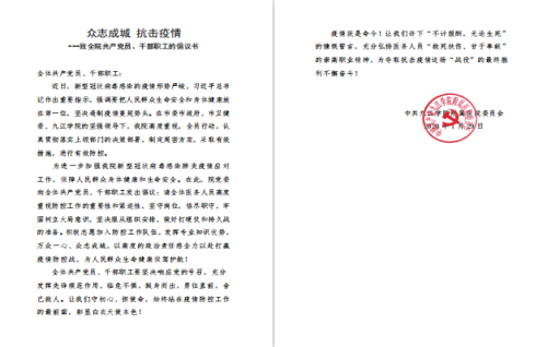 医院党委发出的“众志成城,抗击疫情”倡议书