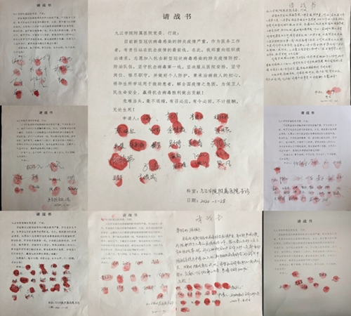 医院党政领导班子带头签署请战书,各支部、各科室积极响应号召,一张张按满红手印的“请战书”纷至沓来,覆盖急诊、重症、外科、内科、医技等40多个科室和部门,近1000名医护人员积极响应,其中全院各党支部300多名在职党员全部递交了“请战书”。
