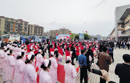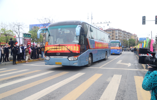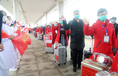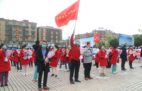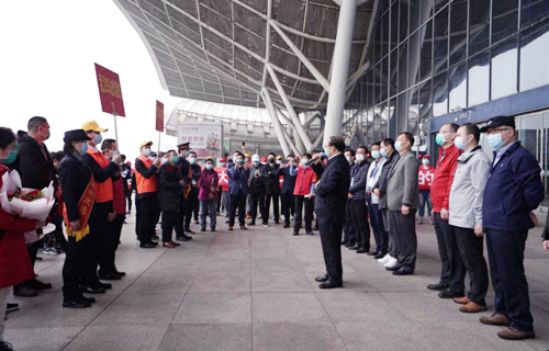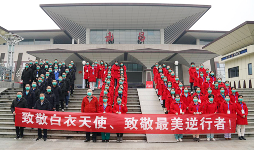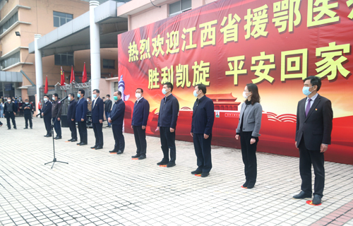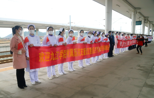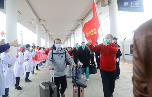 在庐山火车站的欢迎仪式上,队长殷小平说:“作为江西省11支医疗队中唯一的主要领导带队,唯一的地市级医院整建制的85人重症医疗队,能在国难之时,到国家和人民最需要的地方去,我们深感使命神圣而光荣;肩负九江市委市政府和 领导的重托,我们更坚定了驱散疫情、战胜顽毒的决心;面对医院同事和父老乡亲的祝福与期盼,我们深感责任重大,必当全胜而归。”