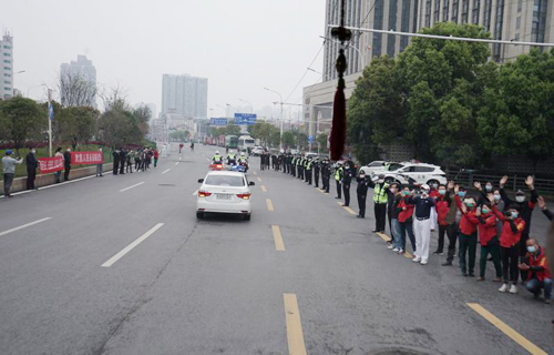 3月22日早上,武昌区援汉医疗队协调组,区政府办,区商务局,区市场监督局,区交通局,区公安分局,区交通大队,区站前派出所工作人员在中山路排成了长长的欢送队伍。热情的武汉市民也拉着横幅夹道欢送,一声声“谢谢你们”“向英雄致敬”“感谢恩人”令人泪目。驻地酒店还在“感谢白衣天使,致敬最美逆行者”横幅上集体签名,表达对支援医护人员的深深敬意。面对武汉沿街欢送队伍的挥手和敬礼,很多队员热泪盈眶。
