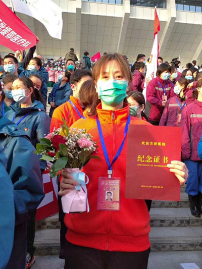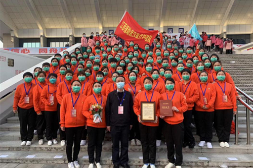 附属医院第二批支援湖北医疗队员——殷美霞和章婷。从2月7日凌晨两点起,她们正式进入洪山体育馆方舱医院,作为九江支援湖北护理队队长、江西护理医疗队护理组长,殷美霞、章婷带领着她们各自护理团队,每天为160多位新冠肺炎患者进行医疗护理工作。3月10日下午3点半,随着最后一批49名患者从方舱医院治愈出院,运行了35天的武汉市首个方舱医院正式休舱,在这35天里,殷美霞、章婷所在的“江西护理队”方舱C区共收治282名患者,她们的“江西护理排班模式”被制定成模板推广到了青海、广西、河北等医疗护理队,她们被国家卫健委授予“全国卫生健康系统新冠肺炎疫情防控工作先进集体”称号,被江西省妇联授予“江西省三八红旗集体”称号。殷美霞因在疫情防控斗争中表现突出,获中共九江市委组织部、九江市人力资源和社会保障局通报嘉奖。