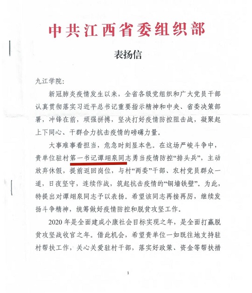 近日,江西省委组织部给 发了一封表扬信,表扬 驻武宁官莲乡东山村第一书记谭翊泉在疫情防控中勇当“排头兵”,放弃休假,与村两委干部、农村党员群众一道,筑起抗击疫情的“铜墙铁壁”。