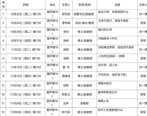郭玉荣:为了开展好这次系列讲座,学院党委首先在双高(高职称、高学历)教师中精心挑选了12名教师组成“道路与人生”系列讲座教学团队。这12名教员,由华锋院长和我带头,有留学归国博士,有曾在企业工作近二十年的老专家,有获得国家自然科学基金的青年博士等。年龄跨度从60后、70后到80后,更有90后。他们在自己求学、工作的人生道路上平凡而丰富的成长经历,对广大新生具有非常重要的现实指导意义。