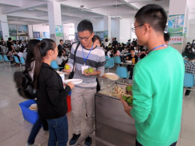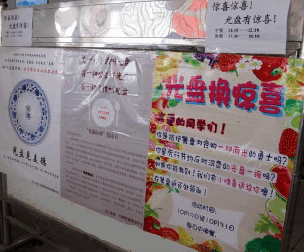 就积极响应教育部“厉行节约、反对食品浪费”的号召,在学生中大力开展“文明用餐”系列活动,各个校区的各个食堂同时开展“光盘有惊喜”活动。每一名在食堂内用餐将盘中饭菜吃干净,并主动送返餐具的同学,都能惊喜地获得橘子、苹果、糖果等小礼物。多年来“节约粮食、拒绝浪费”已逐渐成为