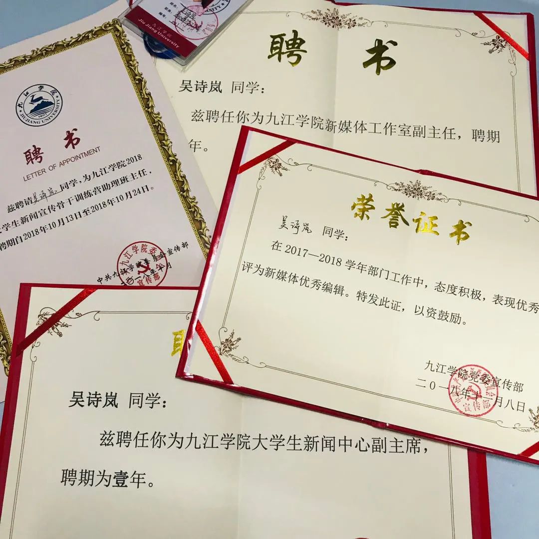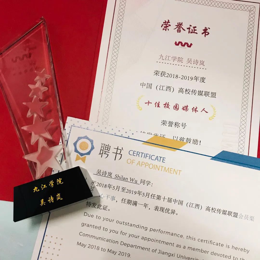 2019年,官方微信公众号“ ”在中国青年报、中国高校传媒联盟举办的“第三届校媒•全国高校新媒体评选”中荣获“最佳人气奖”,同时并多次获得“江西省十佳校园新媒体”称号。作为新媒体工作室主任,吴诗岚带领着工作室成员以 官方微信、 官方微博、 官方QQ为阵地参与学校新闻宣传,追踪校园热点,及时、准确、全面报道校内外重要新闻。