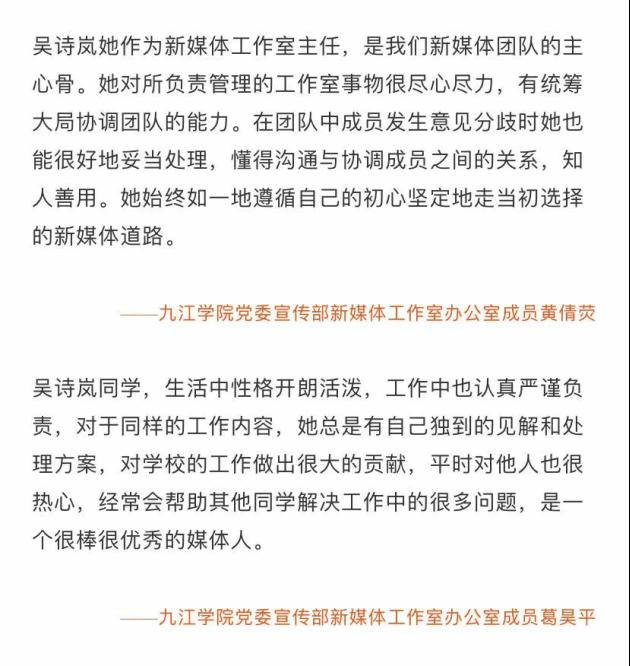 她总能合理安排好自己在工作室的工作。作为新媒体工作室主任,学弟学妹的榜样,她以身作则,心系校园新闻宣传工作,对校园内的大小新闻十分敏感,将大量的课余时间奉献给工作室,工作尽责、亲力亲为,将“讲九院故事、树九院形象”做为自己的大学工作的使命与责任。