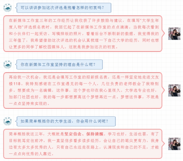 吴诗岚:在新媒体工作室三年的工作经历让我收获了许多鼓励与建议,在填写“大学生年度人物”评选报名表时,我回忆起了在新媒体工作室的点点滴滴。当我每次看到和小伙伴们一起采访、写稿排版的照片,看着后台不断刷新的数据,我觉得我的三年值了,我希望借助这次评选的机会认真梳理一下自己大学的经历,同时也想让更多的同学了解校园媒体人。这就是我参加这次的初衷。