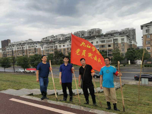 7月11日,电子商务学院党委书记赵宇剑、教工党支部书记李再跃、教工党员仲维春、姚盛辉4名同志组成的电商学院党员先锋队积极参加了学校赛城湖防汛抗洪工作。同志们严格按照汛期I级响应要求,每半小时开展巡查一次,详细做好巡查记录,并针对一区渗水点向赛城湖管委会巡查人员进行了报告。下午3点,管委会工作人员到该校责任堤段,对渗水点进行疏导处理,正逢九江市副市长李小平巡查堤坝防汛工作,他来到
