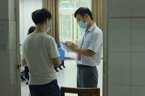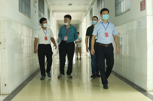 一大早,刘晓东一行冒雨来到香远楼考点,检查考生现场身份审核情况,认真听取教务处负责同志对考务、疫情防控、后勤保障等工作的汇报。考试期间,刘晓东、陈春生一行来到考场监控室,通过视频查看考场整体情况,要求工作人员认真履职,及时发现汇报处理突发事件;深入考区教室逐一巡视,检查考场纪律、教师监考等情况。