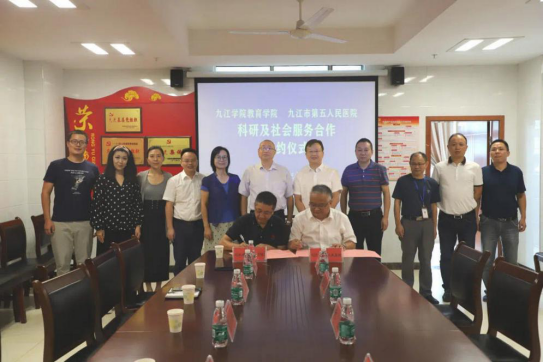为加强学科建设,建设科研实践基地,9月4日上午,我校教育学院与九江市第五人民医院正式签订科研及社会服务合作协议,重点加强三方面合作。副校长陈小林带领教育学院负责同志、该院应用心理学教研室专业教师等参加了签字仪式。