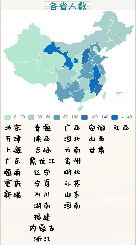在全国30个省市自治区招生,其中安徽、山西、甘肃和江西四个省份的新生人数超过100人。