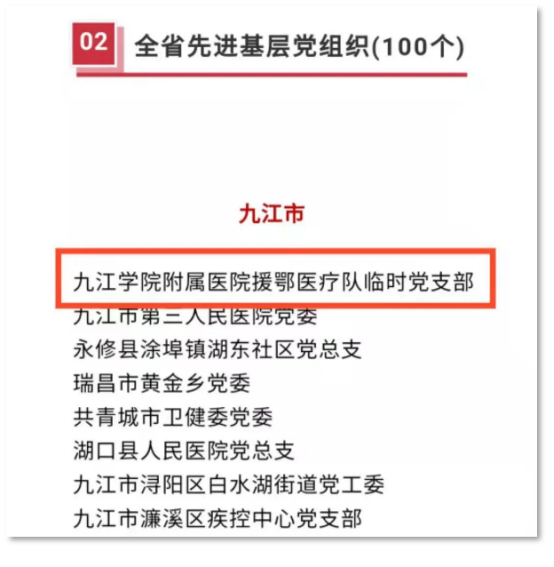 近日,中共江西省委、江西省人民政府作出关于表彰江西省抗击新冠肺炎疫情先进个人和先进集体组织的决定。我校附属医院援鄂医疗队临时党支部获得“江西省抗击新冠肺炎疫情先进集体”和“全省先进基层党组织”称号。我校附属医院副院长、主任医师胡志坚,附属医院急诊科主任、副主任医师但传军,附属医院消化内科副主任、主任医师王细金,附属医院重症医学科副主任、主任医师喻秋平分别获得“江西省抗击新冠肺炎疫情先进个人”称号。