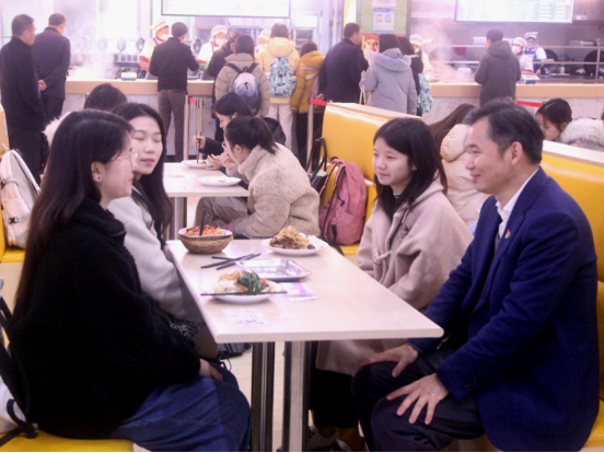 中午12点10分,赵伟来到学生三食堂,与同学们亲切交谈,共进午餐。“家是哪里的?”“住得习惯吗?”“考研的同学多不多?”一坐下来,赵伟就与同学们拉起了家常,顿时拉近了与同学们之间的距离。赵伟详细了解同学们的学习生活等情况,认真听取大家的意见建议。他仔细询问了食堂饭菜质量、卫生、价格以及宿舍情况,并就大学的学习、人生的规划、创新创业、校园建设等问题,与同学们进行了深入交流。
